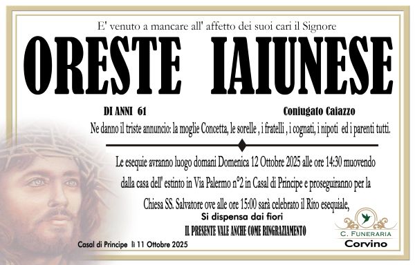 Oreste era conosciuto come una brava persona, gentile, educato e altruista. Lascia la moglie Concetta, le sorelle, i fratelli e i parenti tutti. I suoi funerali saranno celebrati domani alle ore 15 presso la Chiesa SS. Salvatore.