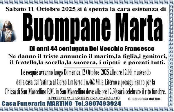 Si chiamava Marta Buompane. Ha lasciato questo mondo per sempre nella giornata di ieri. Abitava a Villa Literno lungo Corso Umberto. Era da tutti conosciuta come una donna eccezionale, buona, gentile, intelligente, altruista, nonché un’ottima madre e moglie, sempre amorevole. Lascia il marito e una figlia, i genitori, il fratello e la sorella.