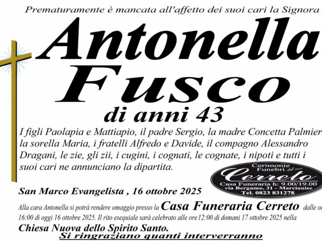 Un profondo dolore ha colpito la comunità di San Marco Evangelista per la prematura scomparsa di Antonella Fusco, venuta a mancare all’età di 43 anni dopo aver lottato con forza e dignità contro una grave malattia che l’ha strappata in via pochi mesi ai suoi cari.