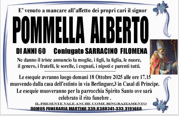 “Con profondo dolore apprendiamo della scomparsa del caro Alberto Pommella. Desidero esprimere il più sincero cordoglio e la mia vicinanza alla famiglia e a tutti coloro che gli hanno voluto bene. Alberto è stato un dipendente esemplare, sempre disponibile e animato da un profondo senso del dovere. La sua umanità e la sua dedizione resteranno un esempio per tutti noi.” scrive l’assessore.