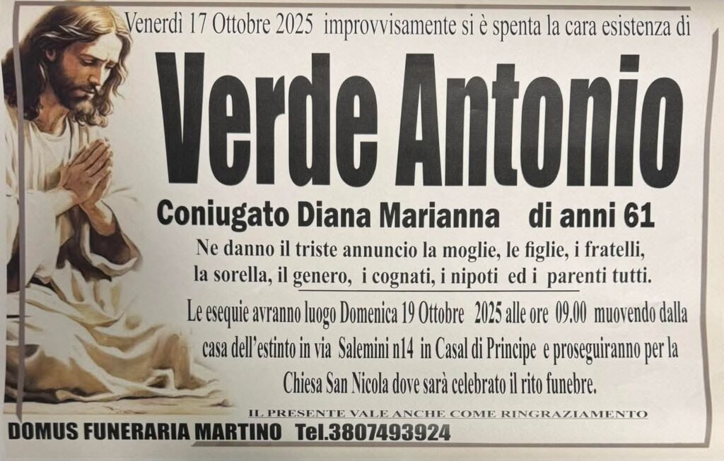 Casal di Principe. Grande dolore a Casal di Principe per la scomparsa improvvisa di un padre fi famiglia. Si chiamava Antonio Verde, aveva 61 anni.