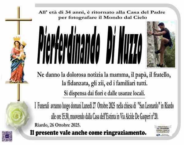 Riardo. Tragedia questa mattina a Riardo. Un giovane di nome Pierferdinando Di Nuzzo, 34 anni, purtroppo se ne è andato via per sempre. La vittima, sfortunatamente, era afflitta da anni da un brutto male che lo ha consumato fino al tragico epilogo.