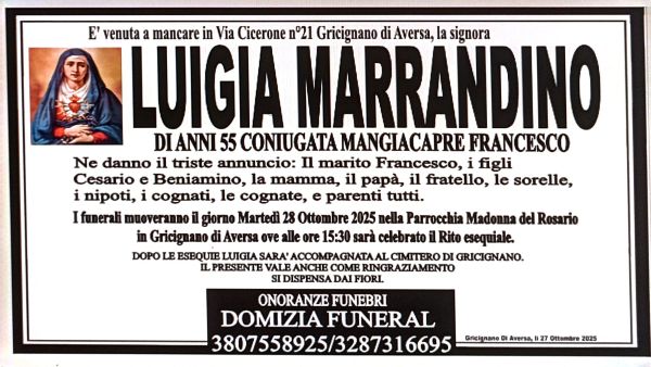 “Esprimo le mie più sentite condoglianze per la perdita di Luigia Marrandino ma tutti la chiamavano “Luisella, una donna e una mamma di due figli Cesario e Beniamino con il marito Francesco che conosco bene. La sua famiglia è “meravigliosa” e del tempo trascorso insieme a parlare e a condividere momenti felici suggerisco che avevo un rapporto molto stretto con tutti loro. È naturale sentirsi tristi e addolorati quando si perde qualcuno che si ama e si stima, in questo momento difficile. Il mio abbraccio forte e sincero ai genitori e fratelli di Luisella, ad Enrico, Angela, Mena e Giulia. Spero che la famiglia di “Luisella possa trovare un po’ di conforto e di pace nel ricordo dei bei momenti trascorsi insieme e nel sostegno degli amici e dei familiari. In momenti come questi, è importante ricordare i bei tempi e le persone care che ci hanno lasciato. Spero che la memoria di Luigia possa essere celebrata e onorata in modo speciale.” scrive un suo amico sui social.