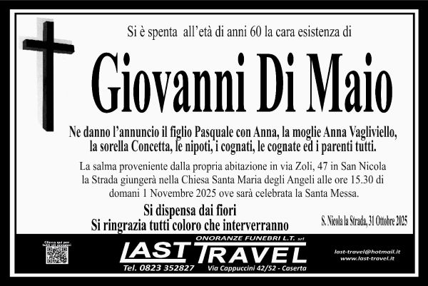 San Nicola la Strada.  Grande dolore oggi a San Nicola la Strada. La città piange la prematura scomparsa di uno dei suoi figli. Si chiamava Giovanni Di Maio, aveva 60 anni.