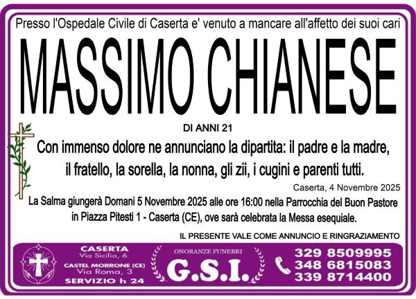 Tanti i messaggi di cordoglio sui social in suo onore. I suoi funerali si terranno domani alle ore 16 presso la Parrocchia del Buon Pastore in Piazza Pitesti a Caserta.