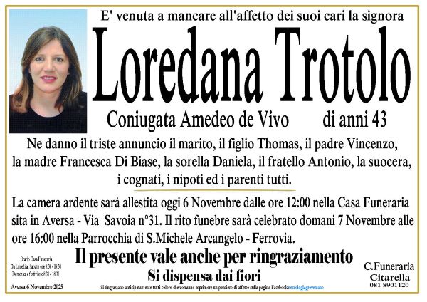 Si chiamava Loredana Trotolo. Un drammatico evento che ha colpito duramente gli amici e i familiari della donna, ora in lacrime e distrutti. La tragica perdita ha gettato nel dolore e nello sconforto il marito Amedeo, il figlio Thomas, il padre Vincenzo, la madre Francesca, la sorella Daniela, il fratello Antonio e i parenti tutti.