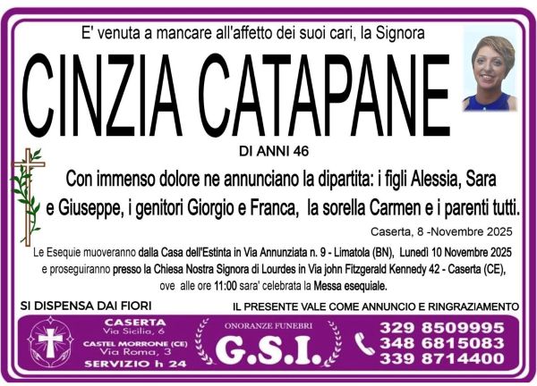 Si chiamava Cinzia Catapane, aveva 46 anni. Era afflitta da un brutto male e nonostante gli sforzi dei medici, purtroppo per lei non c’è stato nulla da fare. Da tempo viveva a Limatola, a Benevento, ma era originaria di Caserta, della frazione San Clemente. Le due comunità, scosse per la brutta notizia, hanno subito mostrato la loro vicinanza ad amici e parenti per dare loro conforto e supporto mentre affrontano il dolore di questa tragica perdita.