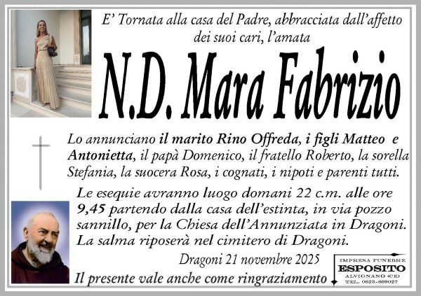 Lascia il marito Rino e due figli di 22 e 18 anni, Matteo e Antonietta. I suoi funerali avranno luogo domani alle ore 9:45 nella Chiesa dell’Annunziata a Dragoni.