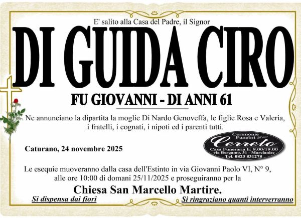 Macerata Campania. La frazione Caturano, di Macerata Campania, è oggi in lutto per la prematura perdita di un padre di famiglia. Si chiamava Ciro Di Guida, aveva 61 anni.