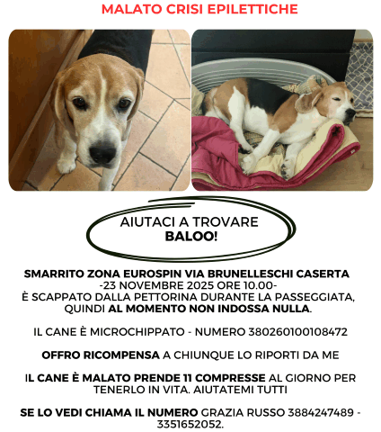 Caserta. Un Beagle di 11 anni, di nome Baloo, affetto da una grave malattia neurodegenerativa e da forti crisi epilettiche, è stato smarrito durante la mattinata di domenica intorno alle 10, nella zona Eurospin di Via Brunelleschi, a Caserta. È scappato dalla pettorina durante la passeggiata e attualmente non indossa nulla.