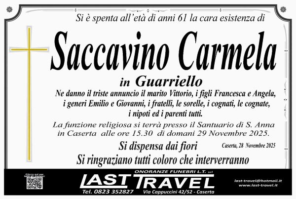 Caserta. La città di Caserta piange una delle sue figlie che se ne è andata purtroppo prematuramente. Si chiamava Carmela Saccavino, una madre di famiglia che aveva 61 anni.