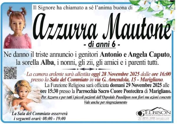 Si chiamava Azzurra Mautone. Un terribile male l’ha purtroppo consumata fino al tragico epilogo. Un male che le ha impedito di crescere, di vivere, di giocare, che l’ha strappata via dalle braccia dei genitori ora in lacrime e devastati.