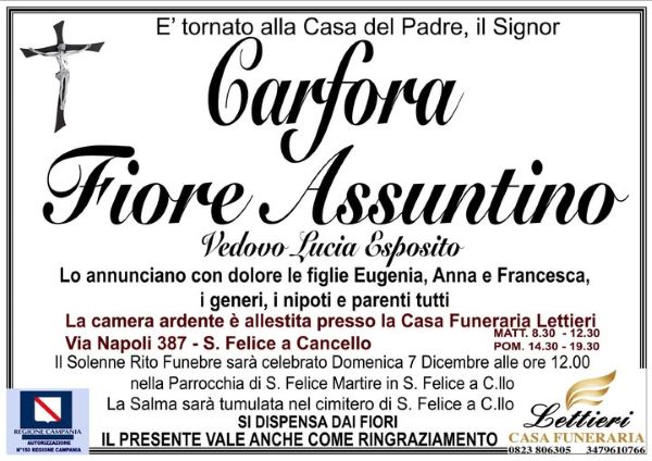 I suoi funerali avranno luogo domani alle ore 12 presso la Parrocchia di San Felice Martire a San Felice a Cancello, ad diffondere il triste annuncio le figlie Eugenia, Anna e Francesca, i nipoti e i parenti tutti.