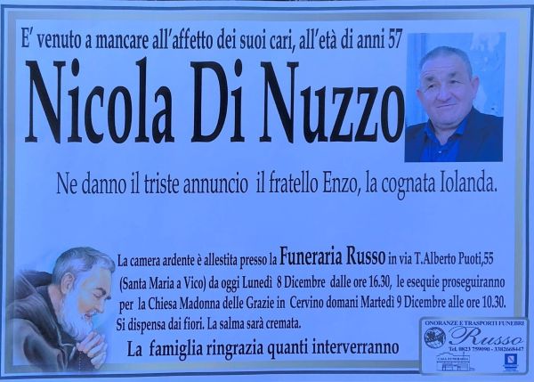 I suoi funerali avranno luogo domani alle ore presso la Chiesa Madonna delle Grazie a Cervino alle ore 10:30.
