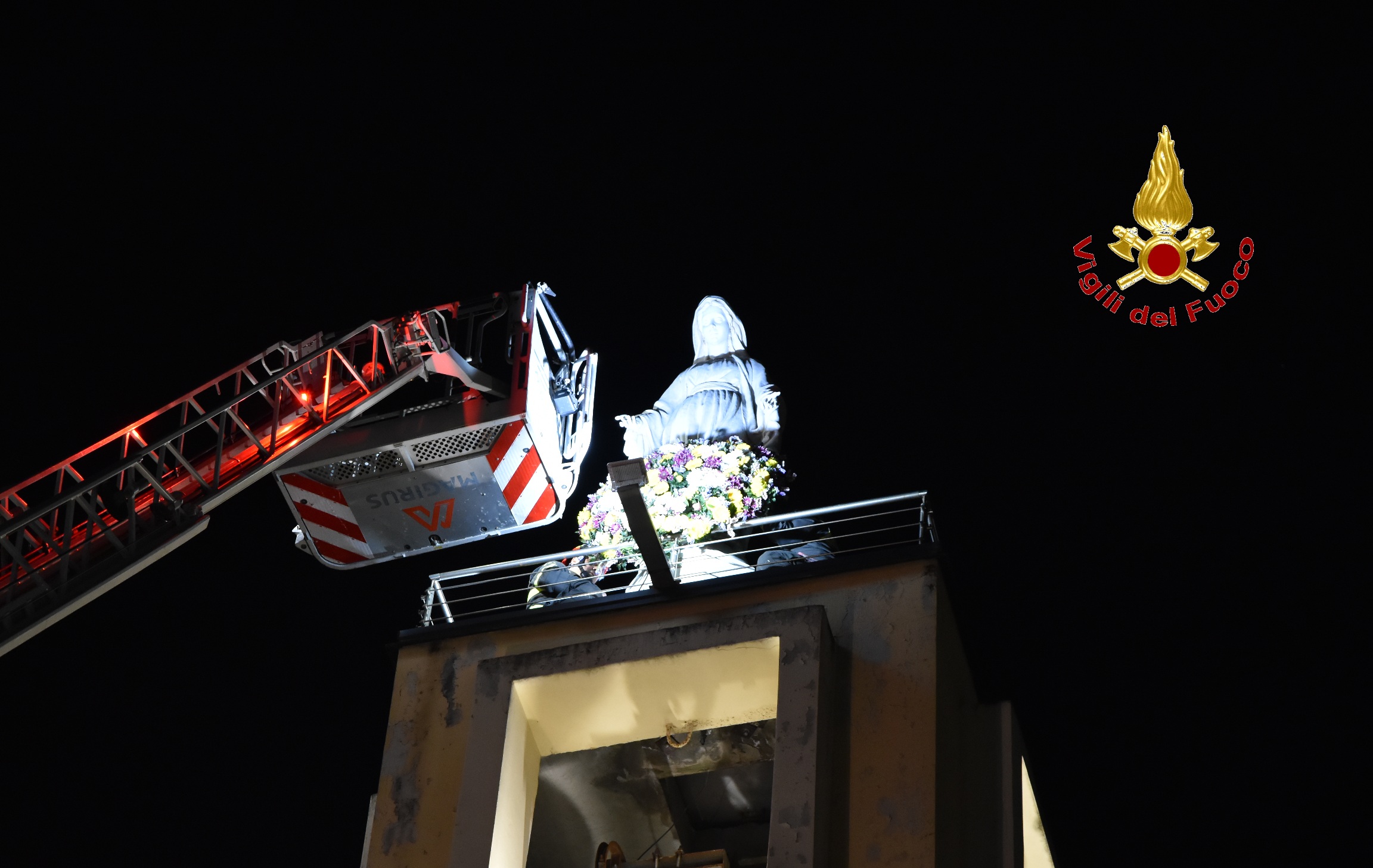 Durante la celebrazione religiosa delle ore 18:30, una squadra dei Vigili del Fuoco ha deposto una corona di fiori ai piedi della statua della Madonna collocata sulla sommità del campanile. L’intervento è stato eseguito con l’ausilio dell’autoscala in dotazione al Comando, garantendo come sempre la massima professionalità e sicurezza nelle operazioni.