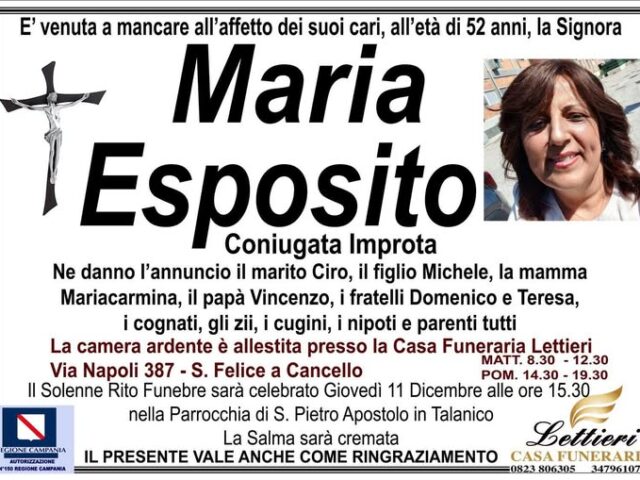Si chiamava Maria Esposito, aveva 52 anni. La sua dipartita ha colpito duramente amici e parenti ora distrutti dall’accaduto. Maria era conosciuta come una donna intelligente, dolce, altruista, una persona buona e gentile, un’ottima madre e moglie, sempre disponibile per aiutare. La comunità saputa la triste notizia, si è subito avvicinata ai familiari per cercare di confortarli e aiutarli mentre stanno affrontando una tale tragedia.