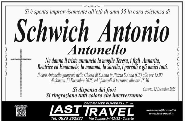 “Con profondo cordoglio ci uniamo al dolore della famiglia Schwich per la scomparsa di Antonello. Antonello Schwich ha fatto parte della nostra famiglia sportiva come istruttore, lasciando un ricordo umano e professionale che resterà nel tempo. In questo momento di grande tristezza, il nostro pensiero va a chi gli ha voluto bene, chi ha lavorato con lui e a tutta la società Intercasertana. Ciao Antonello. Riposa in pace.”