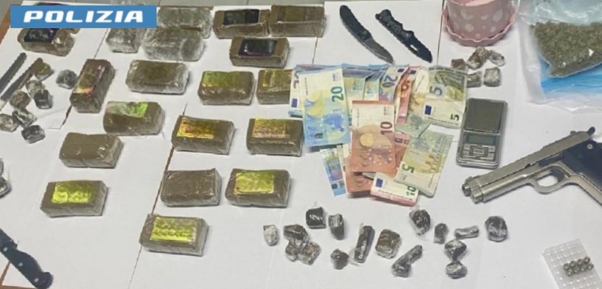 Nello specifico, gli agenti del Commissariato di Nola, con l’ausilio di un’unità cinofila antidroga dell’Ufficio Prevenzione Generale e Soccorso Pubblico, durante i servizi all’uopo predisposti, hanno effettuato un controllo presso l’abitazione del predetto, dove hanno rinvenuto oltre 2 kg di hashish e circa 40 grammi di marijuana, una pistola a salve, 8 cartucce a salve, 5 coltelli, un bilancino di precisione, diverso materiale per il confezionamento della droga e 205 euro, suddivisi in banconote di diverso taglio.