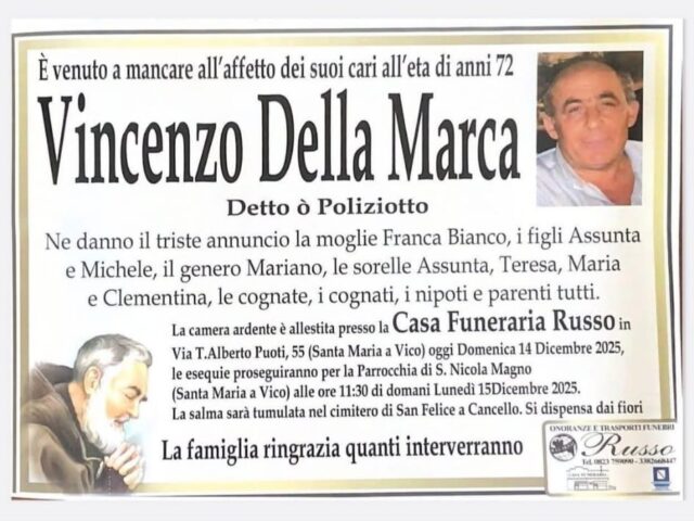 Santa Maria a Vico. Dolore a Santa Maria a Vico per la morte di Vincenzo Della Marca, deceduto all’età di 72 anni a causa di un brutto male che purtroppo lo ha consumato fino al tragico epilogo.