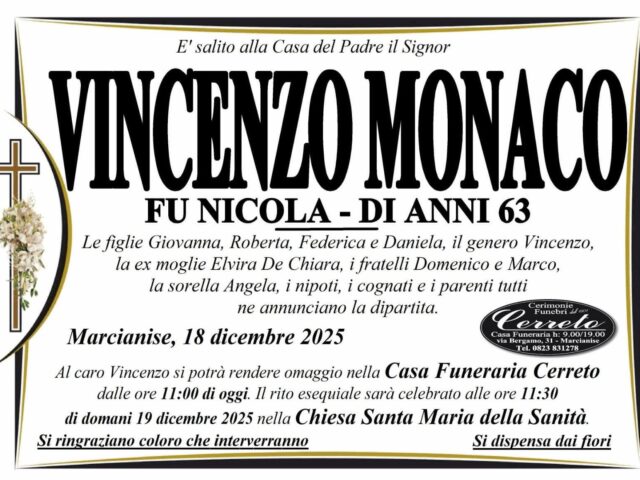 Come annunciato nel manifesto funebre, la salma è presso la Casa Funeraria Cerreto di Marcianise, dove parenti, amici e conoscenti possono rendere omaggio a Vincenzo Monaco. Il rito esequiale sarà celebrato alle ore 11:30 di oggi nella Chiesa di Santa Maria della Sanità, sempre a Marcianise.