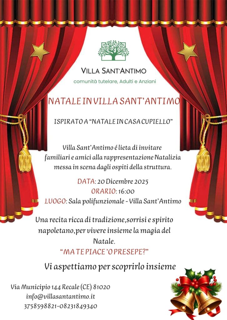 Per l’occasione, la struttura è lieta di invitare familiari e amici alla rappresentazione Natalizia che si terrà nella Sala polifunzionale, per passare un pomeriggio tra risate e gioia. Sarà una recita ricca di tradizione, sorrisi e spirito napoletano, per vivere insieme la magia del Natale.