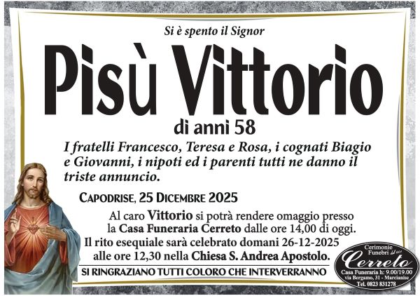 I suoi funerali avranno luogo domani alle ore 14 presso la Chiesa S. Andrea Apostolo.