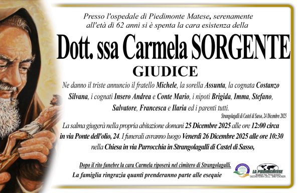 Castel di Sasso. Grave lutto a castel di Sasso, una stimata e conosciuta giudice si è purtroppo spenta prematuramente. Si chiamava Carmela Sorgente, aveva 62 anni.
