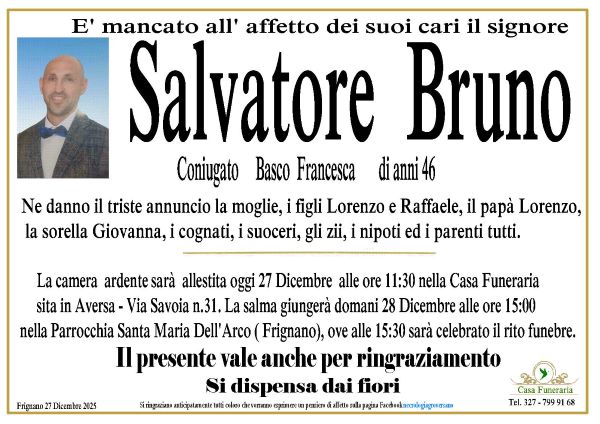Si chiamava Salvatore Bruno, aveva 46 anni. Aveva un brutto male contro cui ha combattuto e non si è mai arreso, ma sfortunatamente, quel male, nonostante gli sforzi, alla fine ha vinto causando il drammatico epilogo. Da tutti era conosciuto come un uomo perbene, gentile ed educato, un lavoratore onesto, una persona altruista e un ottimo padre e marito.