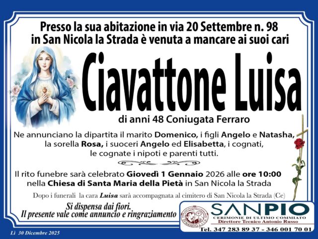 Si chiamava Luisa Ciavattone. Conosciuta come una donna dolce ed educata, un’ottima madre e moglie, gentile e altruista. Una persona su cui si poteva contare. Lascia il marito Domenico, i figli Angelo e Natasha, la sorella Rosa e i parenti, ora costretti ad attraversare un momento così buio.