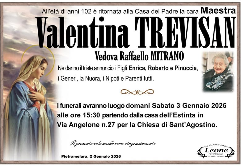 Pietramelara. La comunità di Pietramelara dice addio alla sua nonna centenaria. Valentina Trevisan, se ne va a 102 anni. Per molti anni è stata una maestra e ha educato tantissimi alunni della città.