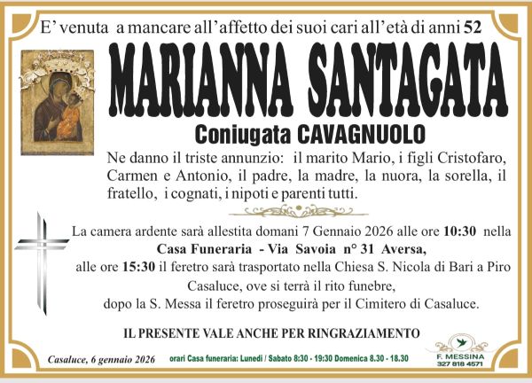 Si chiamava Marianna Santagata aveva 52 anni. La sua scomparsa ha gettato nel dolore e nello sconforto amici e parenti. Era conosciuta come una donna gentile, educata, intelligente, un’ottima moglie e madre di famiglia. Lascia un vuoto incolmabile in chi ha avuto la fortuna di conoscerla.
