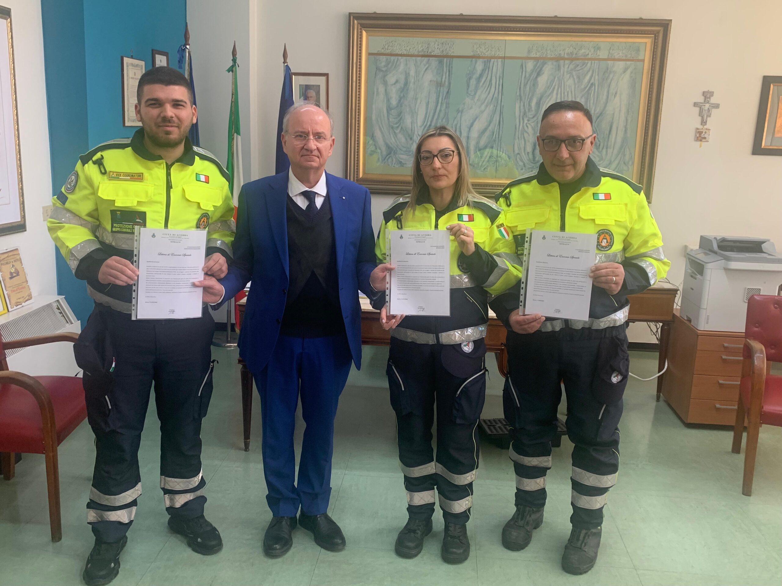 Con una cerimonia che si è tenuta questa mattina in Municipio in presenza dell’assessore al ramo Francesca La Montagna e del Coordinatore del Gruppo Comunale Volontari di Protezione Civile di Acerra Salvatore Picardi, il sindaco Tito d’Errico ha consegnato una Lettera di Encomio Speciale ai volontari del GCVPC Giovanni Rollo (vicecoordinatore del Gruppo), Antonietta Sapio e Giovanni Terracciano.