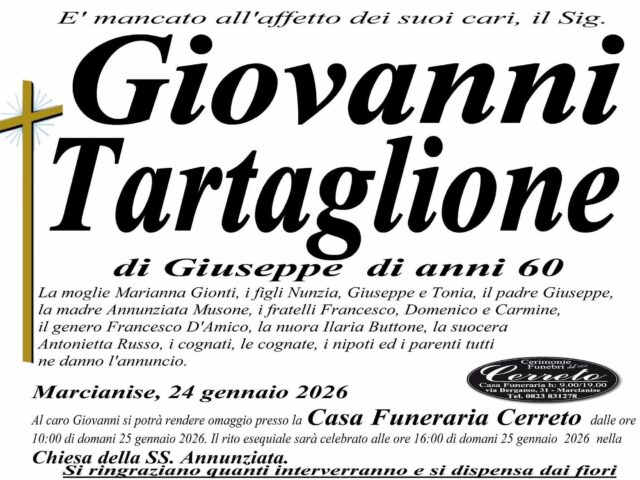 I funerali si svolgeranno oggi, 25 gennaio 2026, alle ore 16.00, presso la Chiesa della SS. Annunziata di Marcianise. Dalle ore 10.00 sarà possibile rendere omaggio alla salma presso la Casa Funeraria Cerreto. La famiglia ha espresso la volontà di dispensare dai fiori, ringraziando quanti parteciperanno al lutto con la loro presenza e il loro affetto.