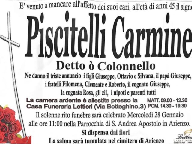 Il 45enne residente nella zona alta della Nazionale Appia lascia i figli Giuseppe, Ottavio e Silvana, il papà Giuseppe, i fratelli Filomena, Clemente e Roberto, i cognati e gli altri parenti.