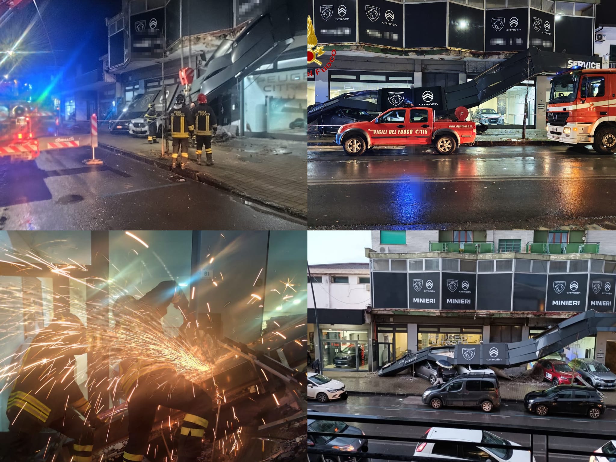 C’è stato il cedimento improvviso di una grande insegna pubblicitaria che si trovava fuori ad una concessionaria di automobili Citroen e Peugeout Minieri situata lungo la strada, che ha travolto delle vetture che si trovavano in esposizione. Al momento del crollo, per fortuna non c’era nessuno, né clienti, né passanti e così nessuno è rimasto ferito o peggio.