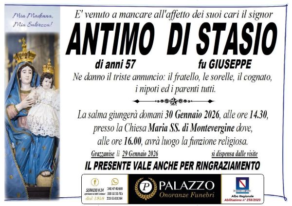 I suoi funerali saranno celebrati questo pomeriggio alle ore 16 presso la Chiesa Maria SS. di Montevergine.