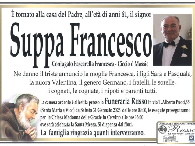 Suppa lascia la moglie Francesca Pascarella, i figli Sara e Pasquale, la nuora Valentina, il genero Germano, i fratelli, le sorelle e gli altri parenti.