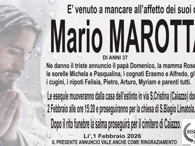 Nelle ultime ore la famiglia ha reso note le disposizioni per l’ultimo saluto. I funerali di Mario Marotta si svolgeranno domani, 2 febbraio, con partenza dalla casa dell’estinto in via Santa Cristina a Caiazzo alle ore 15:20. Il rito funebre sarà celebrato presso la chiesa di San Biagio a Limatola. Al termine della cerimonia religiosa, la salma proseguirà per il cimitero di Caiazzo, dove avverrà la sepoltura.