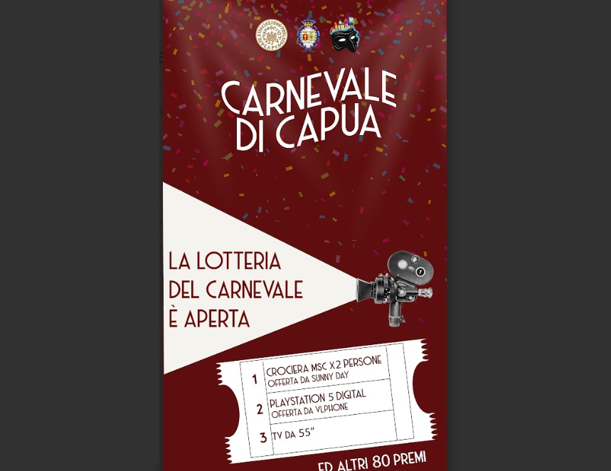 In corso la vendita dei biglietti della lotteria legati alla manifestazione. Con soli 2€ si può tentare la fortuna. Il Carnevale di Capua non porta solo allegria e maschere, ma anche la possibilità di vincere premi incredibili. Con soli 2 euro si può sostenere la storica manifestazione carnascialesca capuana e provare a portare a casa una fantastica Crociera MSC per 2 persone (offerta da Sunny Day) come primo premio ; una desideratissima PlayStation 5 Digital (offerta da Vlphone) come secondo premio; una TV da 55” per godersi il cinema a casa quale terzo premio; previsti altri 80 premi in palio.