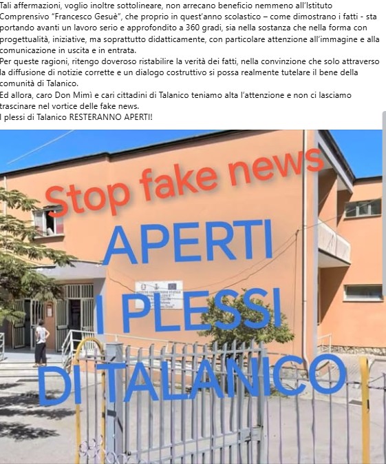 Il post da ‘maestrina’ con le scritta rossa ‘fake news’ e con la scritta blu ‘Aperti i plessi di Talanico’, in risposta alla lettera firmata dal parroco alla sua comunità pubblicata nelle ultime ore sul giornalino della frazione, non ci piace proprio.