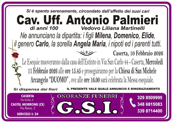 Caserta. Oggi è un giorno di grande tristezza per la città di Caserta che si appresta a dire addio ad Antonio Palmiere, Cavaliere Ufficiale che si è spento all’età di 100 anni.
