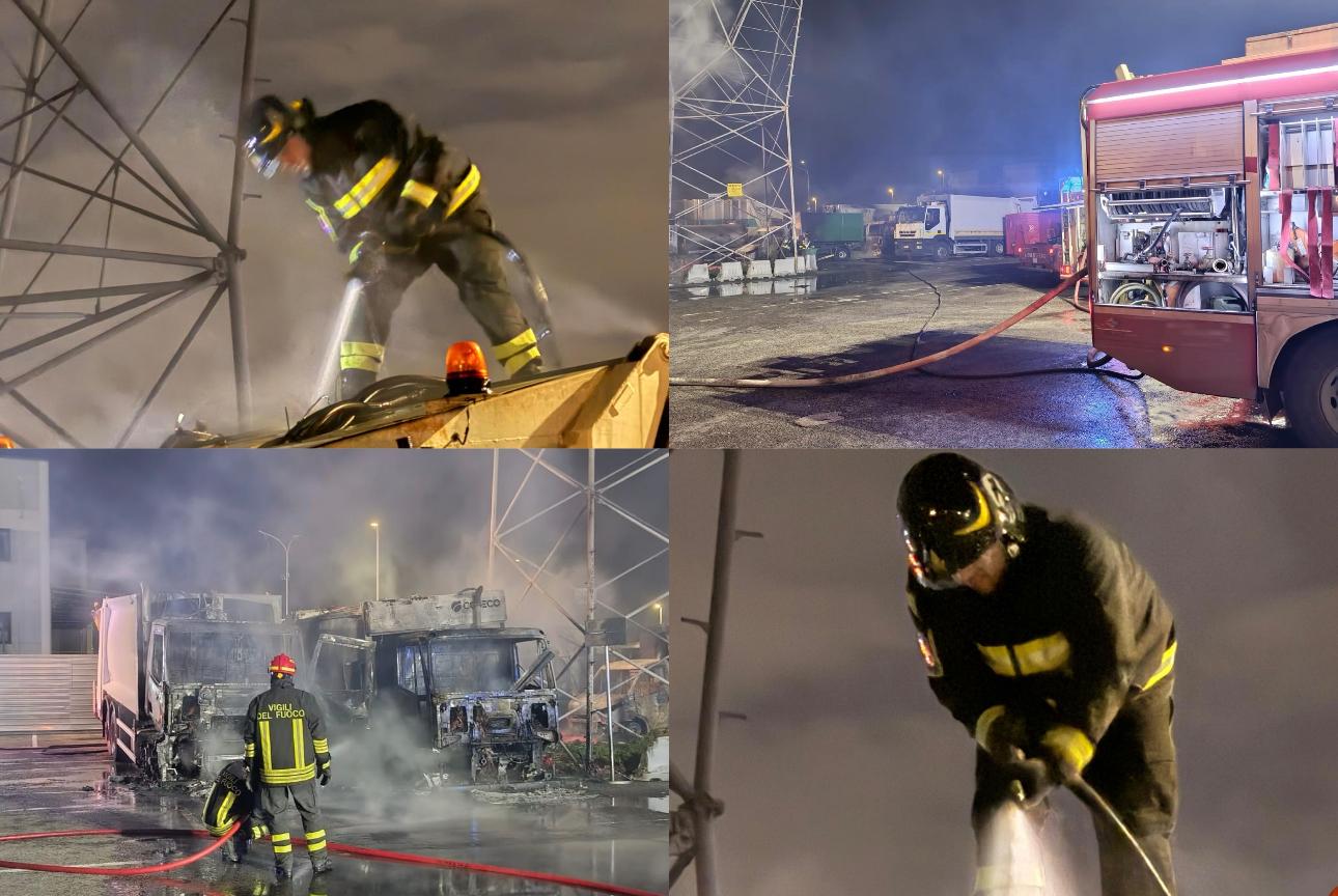 L’incendio ha coinvolto sette veicoli, generando una folta nube di fumo nero visibile a grande distanza. Il tempestivo intervento dei Vigili del Fuoco ha consentito di circoscrivere e domare le fiamme, evitando la propagazione dell’incendio ad altri mezzi presenti nell’area e a un capannone adiacente.