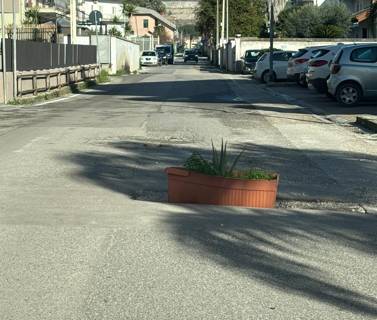 In quell’area la strada presenta una enorme buca, e così hanno ben pensato di sistemare un grosso vaso di piante nella stessa per segnalare la presenza della grossa voragine, in modo da avvisare gli automobilisti e così evitare incidenti o danni alle vetture e pneumatici.