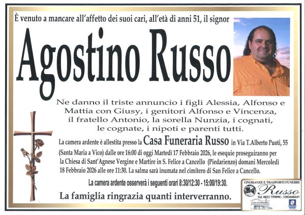 Lascia i figlia Alessia, Alfonso, i genitori Alfonso e Vincenza, il fratello Antonio, la sorella Nunzia e i parenti. I suoi funerali saranno celebrati domani alle ore 11:30 presso la Chiesa di Sant’Agnese Vergine e Martire a Piedarienzo, frazione di San Felice a Cancello.