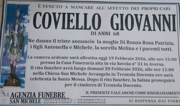 “La scomparsa di Giovanni lascia un vuoto che nessuno potrà mai colmare. Uomo integro, padre esemplare, Ufficiale di Polizia Locale ad Aversa, che ha incarnato con la vita il senso del dovere, della rettitudine e dell’impegno verso il prossimo. Sempre al fianco di chi soffriva, sempre disponibile, Giovanni è stato per tutti noi un punto di riferimento morale. Alla famiglia e in particolare alla figlia Antonella Coviello, nostra compagna di tante battaglie civili, va il nostro cordoglio più sincero. Le parole non bastano a consolare un dolore così grande, ma sappiate che vi siamo vicini con il cuore e con la preghiera. Le nostre più sentite condoglianze.” scrive un utente sui social.
