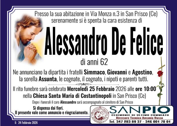San Prisco. Grande dolore a San Prisco per la prematura morte di un uomo di 62 anni. Si chiamava Alessandro De Felice. La sua prematura scomparsa, avvenuta presso la sua abitazione in via Monza, ha scosso la comunità locale.