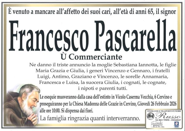 Cervino. Grande dolore a Cervino. Ieri sera, uno stimato commerciante si è purtroppo spento prematuramente. Si chiamava Francesco Pascarella, aveva 65 anni.