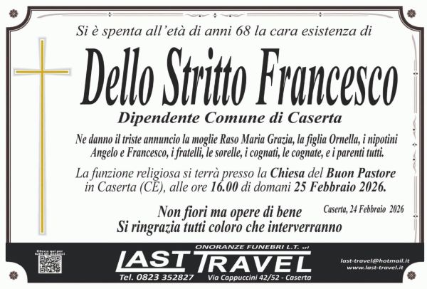 Si chiamava Francesco Dello Stritto, aveva 68 anni. La sua dipartita ha scosso gli amici, i colleghi di lavoro e i familiari. Lascia un vuoto enorme in coloro che hanno avuto la fortuna di conoscerlo e amarlo.