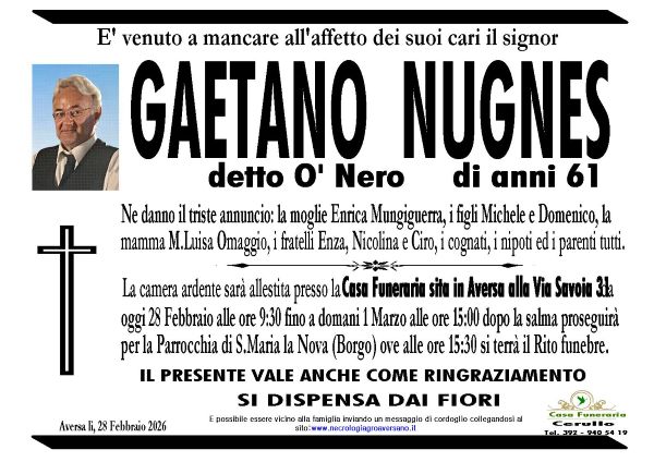 Aversa. Grande dolore per la città di Aversa, un padre di famiglia si è spento prematuramente all’età di 61 anni. Si chiamava Gaetano Nugnes. La sua scomparsa è stata un duro colpo per gli amici e i parenti e tutto coloro che lo conoscevano.