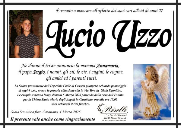 Gioia Sannitica. Domani saranno celebrati i funerali di Lucio Uzzo, il ragazzo di soli 27 anni di Gioia Sannitica che sabato scorso ha perso la vita. La sua salma si trovava presso l’ospedale Civile di Caserta, per gli esami medici.